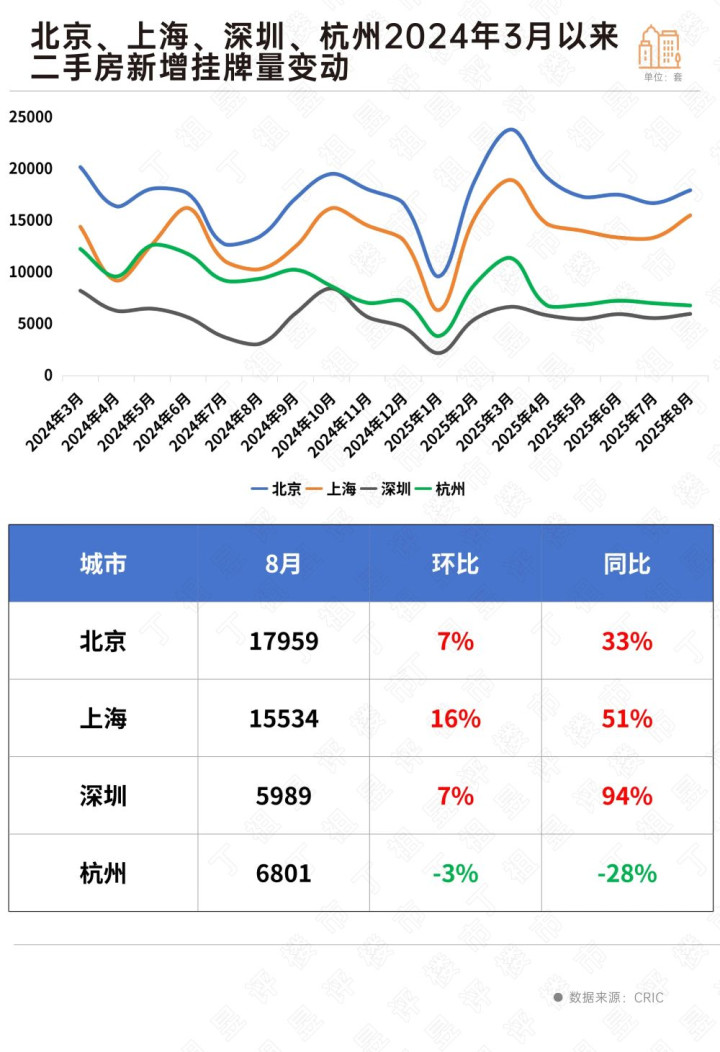 从CRIC监测的北京、上海、深圳、杭州四城新增挂牌套数来看,8月四城挂牌量季节性回升,但四大城市的二手房市场正在经历一场深刻的“信心分化”。