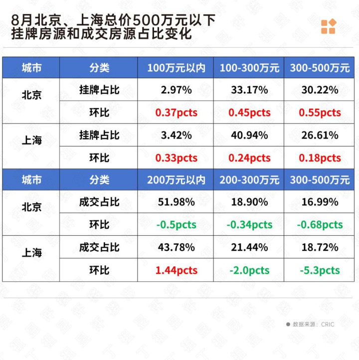 另外,上海600-800万元中改房源挂牌占比显著回升,8月环比增长0.37个百分点至9.29%,而对应的成交占比只有4.94%,且环比下降0.19个百分点。